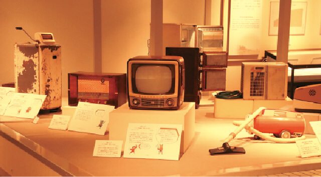 | 「県内の多くの都市では焼け野原になったけど、みんなの努力で急速に復興したよ。暮らしを支えた昔の家電製品もずらりと並んでいるね」 | ||