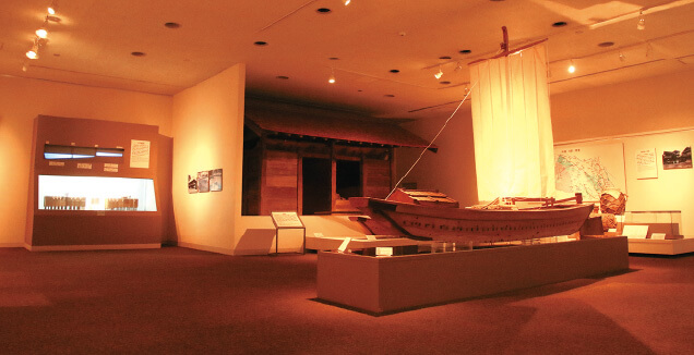 | 「船の模型もあるよ! これは新河岸川を走っていた高瀬舟か。武蔵国には海がないから、江戸と荷物を行き来させるのに、こうした川船を使ったんだね」 | ||