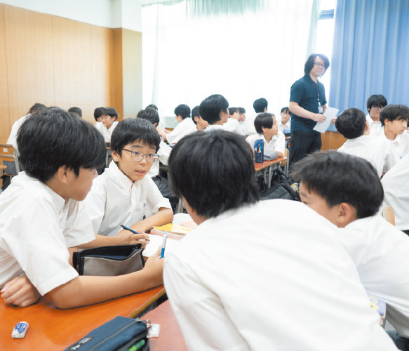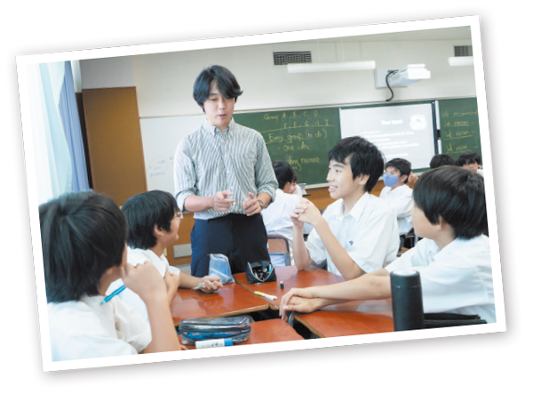 編集部が訪れたのは、中1の「英語」の授業です。週6時間の英語授業のうち、同校では4時間をEL(English Learning)として、残りの2時間をEP(English Practice)としています。EPは日ごろの授業で学んだ英語を実際に使う時間で、ネイティブ教員も参加し、「話す・書く・発表する」力を養っています。