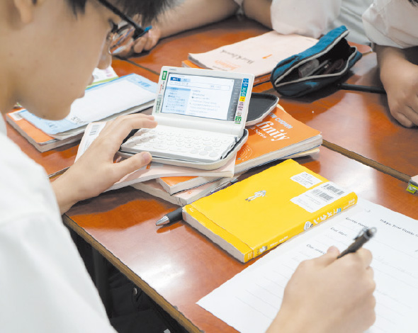 「やっぱり浅草だよね」「いや、渋谷のスクランブル交差点も有名だよ」とお勧めスポットはいくつも挙げられますが、三つの理由には頭を悩ませる生徒が多い様子です。理由を思いついても、どのように英文をつくればいいのかわからず、辞書を読みながら格闘する姿も見られました。