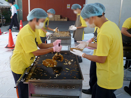 飲食エリアには、焼きそばやホットドッグ、わらび餅、スイーツたこ焼き、かき氷など、12店舗がずらりと軒を連ねます。飲食の出店ができるのは高校生からで、班(クラブ)、クラス、有志で運営します。なかでも焼きそば店は朝から大繁盛です。複数の鉄板で次々と焼きそばが作られ、店頭には行列が絶えません。