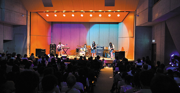 ステージ上でスポットライトを浴びる高校軽音楽同好会。観客による応援で、ホールはさらに白熱しました