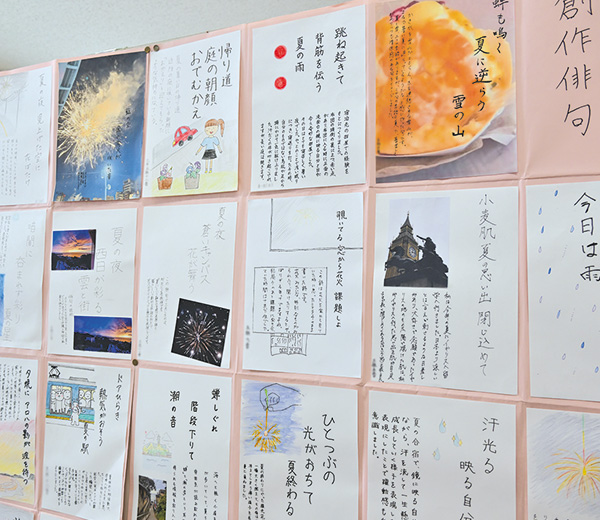 国語科では、中学生の日々の学習成果を展示。中3では、自分で詠んだ俳句に写真やイラストを添えて、世界観を表現するという課題を発表していました