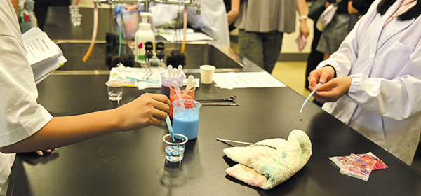 理科班では、化学反応を利用した人工イクラ作りに挑戦できるコーナーを設置。不思議な感触のスライム作りにチャレンジする来場者もたくさんいました
