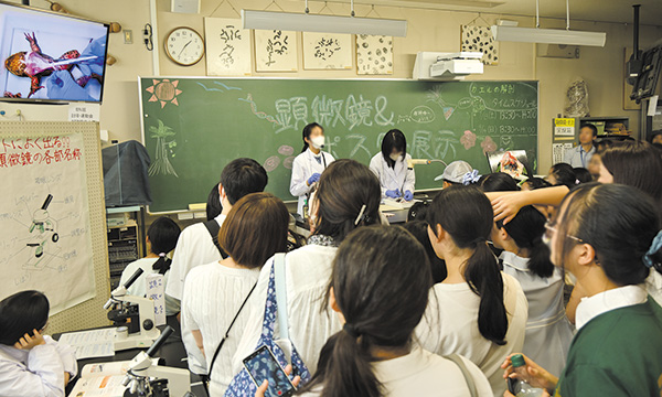 理科教育に力を入れている同校では、理科班の展示が毎年人気を集めています。3号館3階にある化学第1教室では、スライムや人工イクラ作りなどの実験が行われ、小学生たちが班員のアドバイスを聞きながらチャレンジする姿が多く見られました。隣の生物室では、カエルと人間の赤血球を顕微鏡で観察する体験や、日々の活動内容をまとめたポスター展示が行われています。そして、目玉イベントとして毎年多くの見学者でにぎわうカエルの解剖には、生物室からあふれてしまうほど来場者が詰めかけました。