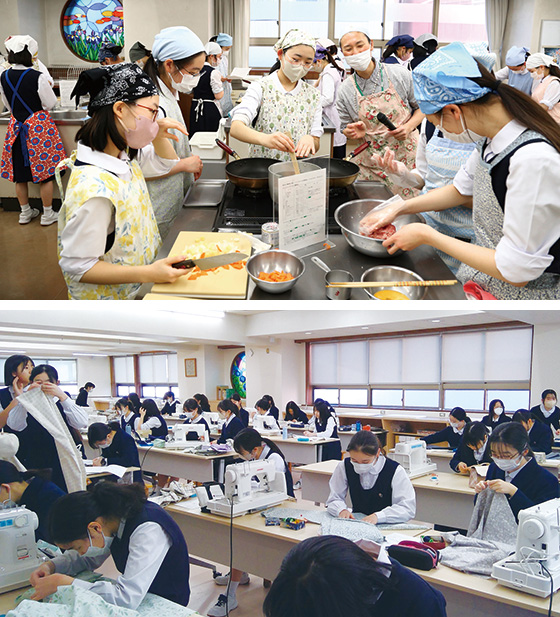 調理実習(上)、被服製作(下)の様子。授業では「自分でやる」「考えながら作業する」ことを重視しています