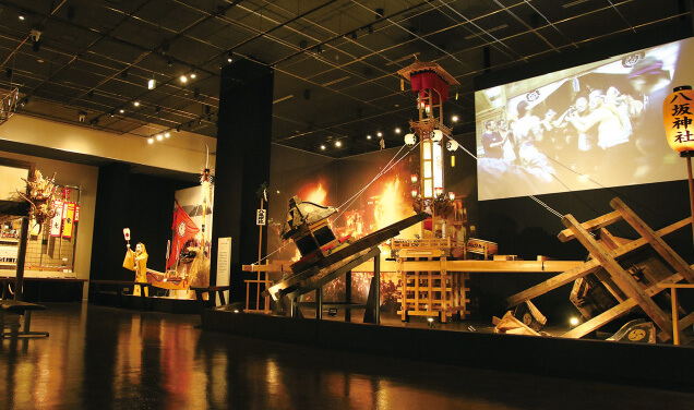| 「わあ、壊れた神輿が転がっている! これは石川県能登半島の宇出津で行われる『あばれ祭』の神輿ね。厄落としのために、神輿を火や水の中に放り込むんだ。実際の映像も流れているけど、すごい大迫力!」 | ||
