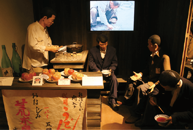 | 「でも結局、日本はアメリカなど連合国に猛攻撃を受けて敗戦。戦後はここで再現されている闇市に頼らないと、とても生活できなかったのね」 | ||