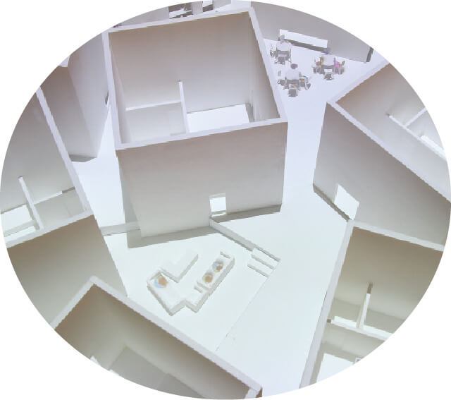 | 「このゾーンの模型には、動く光の点が投影されているよ。これは藤本さんの建築物において人がどのように動くかをイメージした展示なんだって」 |