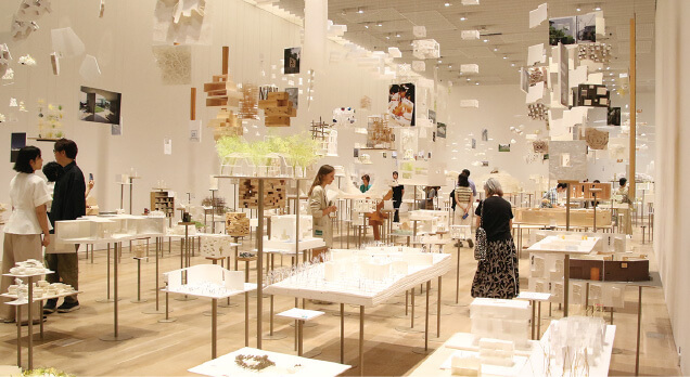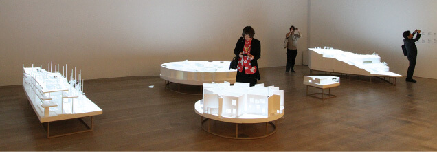 | 「会場に入ってみると…。おおっ、最初のゾーンは建物の模型でいっぱいだ! ここでは藤本さんがこれまでにかかわったプロジェクトを約30年分、100件以上も紹介しているんだ」 | ||