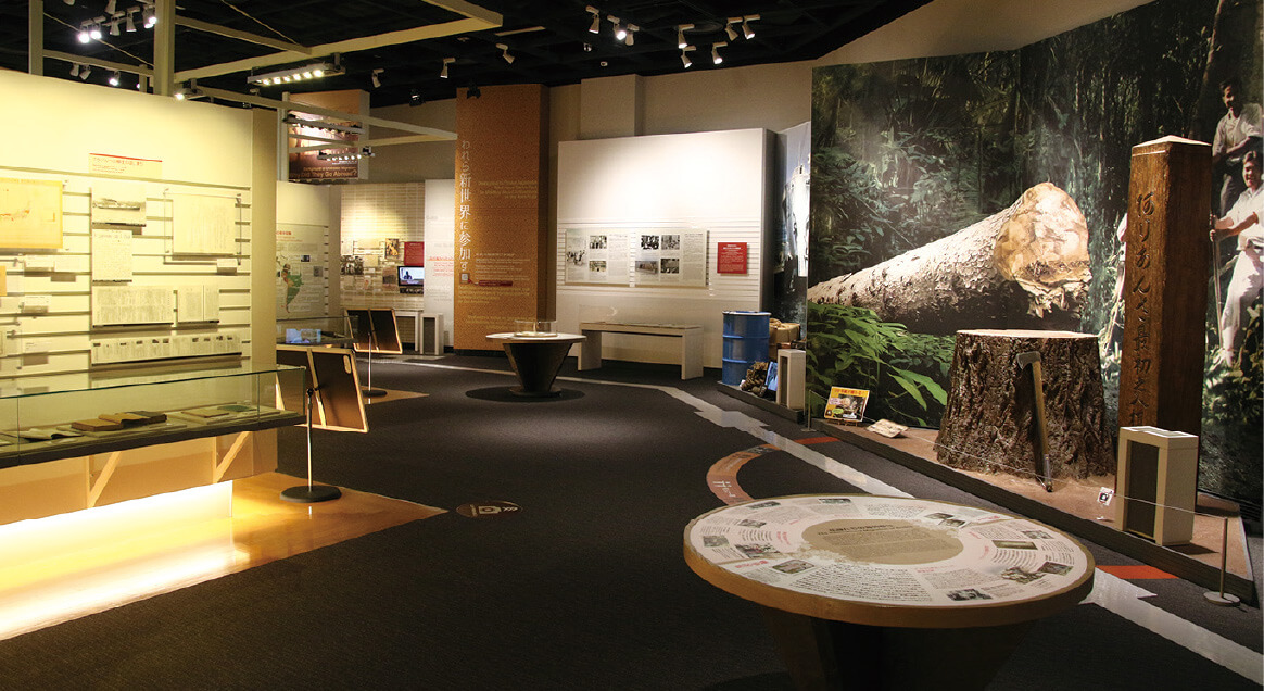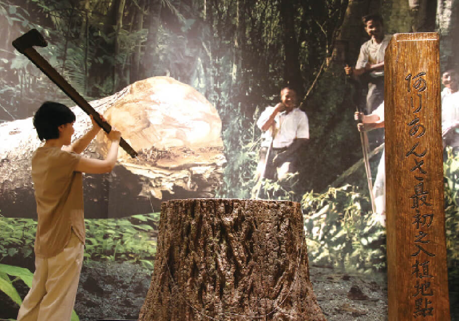 | 「見て! 大きな切り株。これは1925年に移住が始まったブラジル・アリアンサ移住地の展示だよ。自分で農園をつくるために、人々は手作業で森を切り拓いていったんだ」 | ||