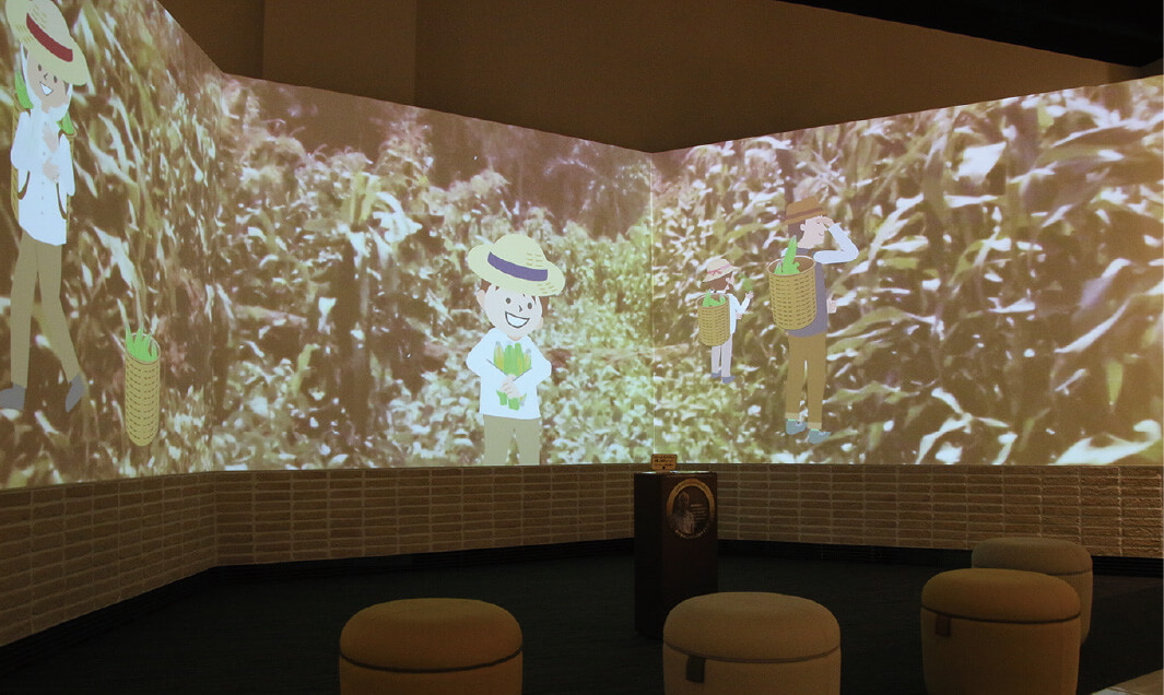 かつて、多くの日本人がブラジルなど南米の国々に移り住んだんだ。館内の大型スクリーンでは、パラグアイのイグアス移住地に関するショートムービーを上映しているよ。この映像は、1956年に横浜港から現地へ渡った当時10歳の移住者の体験に基づいたもの。人々が大地を切り拓き、町を築いていく様子をわかりやすく紹介しているんだ。