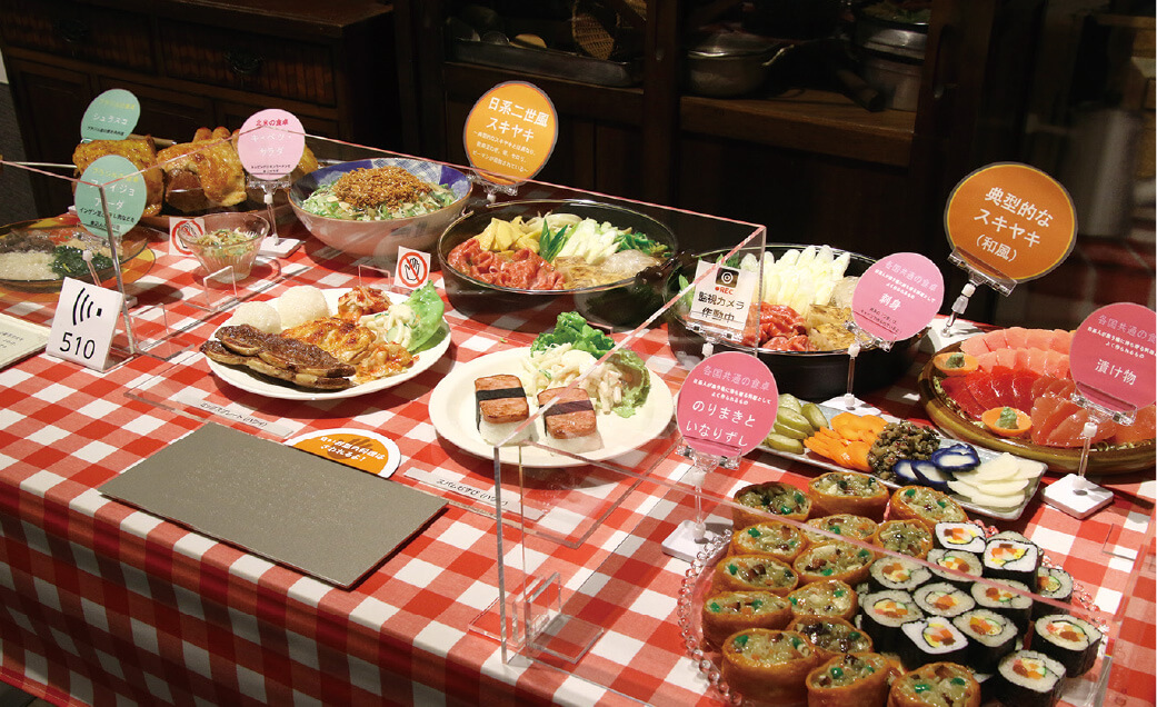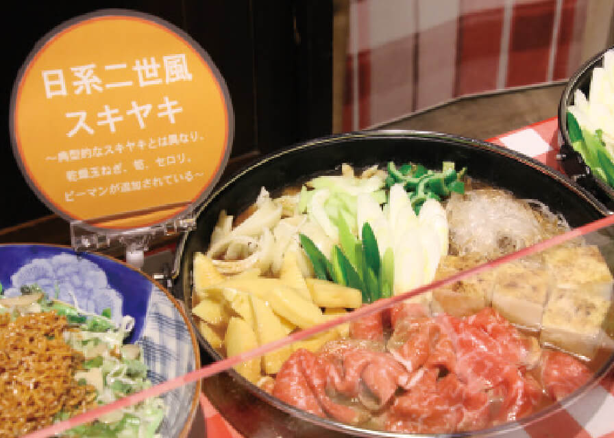 移住先では和の食材が手に入らないこともしばしば。そのため、代用品を使ったアレンジメニューも生まれたんだ。アメリカなどで食べられていた「日系二世風スキヤキ」には、乾燥タマネギやタケノコ、さらにはセロリやピーマンまで入っているよ。