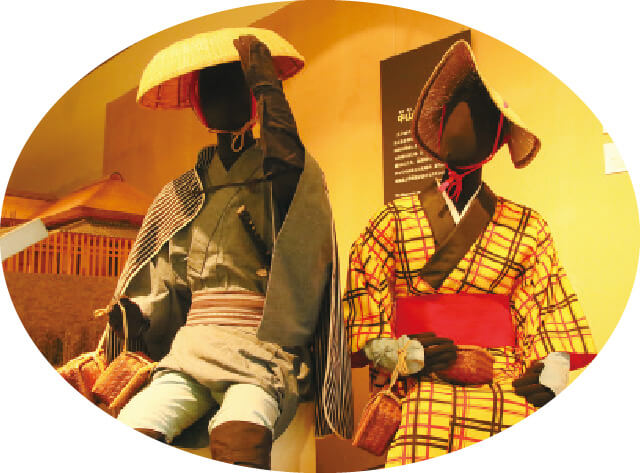 | 「江戸時代も中期までは天下泰平。地方へ延びる五つの街道が整備され、庶民も旅を楽しむようになったのね。そのうち武蔵国を通っていたのは中山道と日光道中。フロアには旅装束の人形もあるよ」 | ||