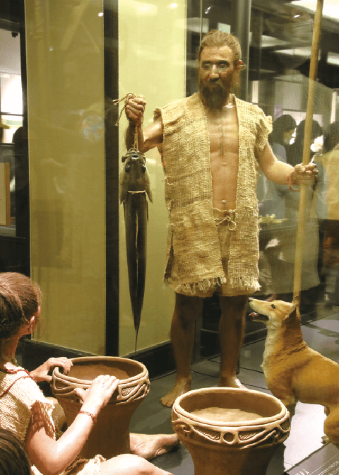 | 「そうしよう! ほほう、館内はいくつもの展示室に分かれているのか。この部屋のテーマは『日本人と自然』だね。日本列島に人が住み着いたのは約4万年前。そこからの日本人の歩みや、自然とのかかわりなどをたどっているよ」 | ||