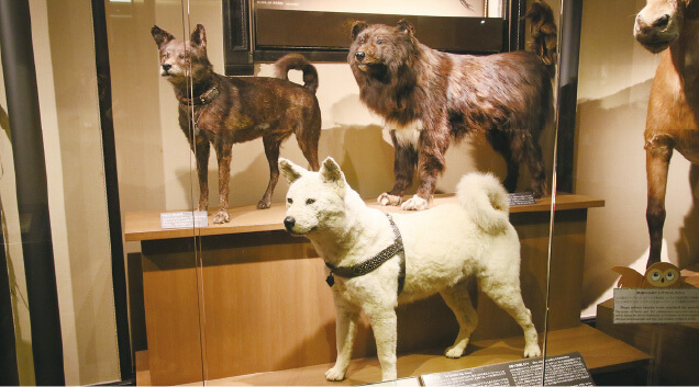 | 「あっ、渋谷のシンボルにもなっている秋田犬、忠犬ハチ公の剥製だ! 南極観測隊のそり引き犬だった樺太犬のジロもいるね。どちらも大きな犬だったんだなあ」 | ||