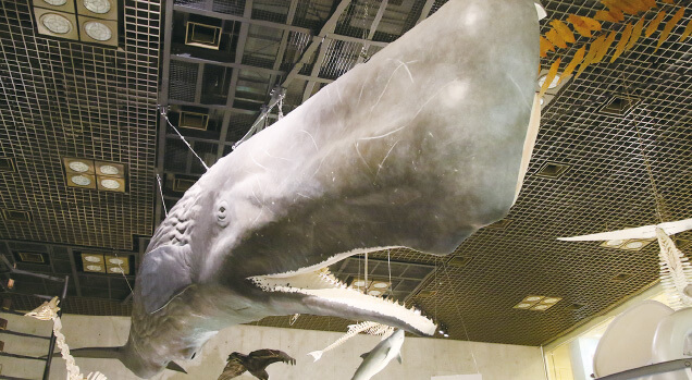 | 「すごい! 天井から体長約14mのマッコウクジラが吊り下がっているよ。これは体の中身を再現した半身模型と、本物の骨格標本を組み合わせた特殊なモデルなんだね」 | ||