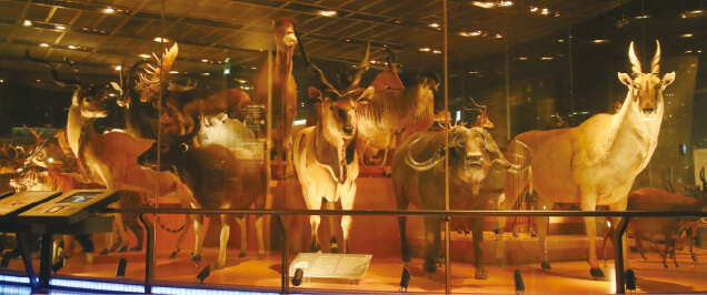 | 「うわあ、哺乳類と鳥類の剥製の大集合だ! 全部で115体? すごい迫力! どこから見ても動物と目が合うように、配置も工夫してあるんだ。うーん、今にも動き出しそう!」 |