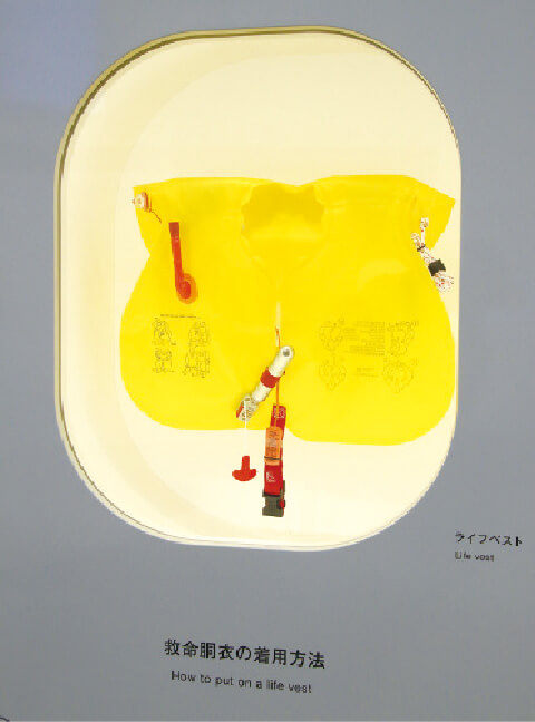 ◀いざというときに身につける救命胴衣。着用方法も紹介されているよ。