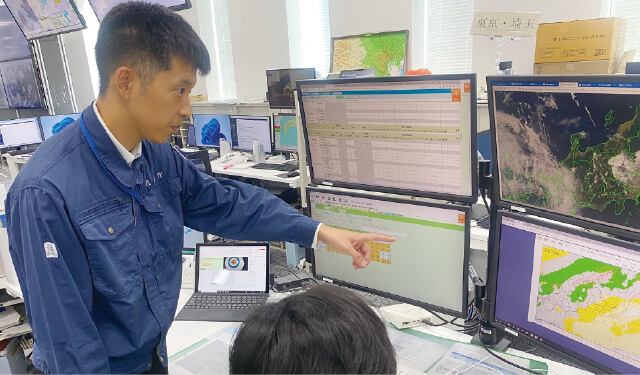 現在は予報を発表するためにシフト勤務をしている職員を取りまとめる仕事を中心に行っている植村さん。予報作業に携わるほか、天気が悪くなると出す情報が増えるため、気象情報も作成しています。関東甲信エリアを担当しているので、エリア内の気象台と情報交換したり、改善したほうがよいルールがないか探り、現場が困っていることに対して対応を考えたりもしています。