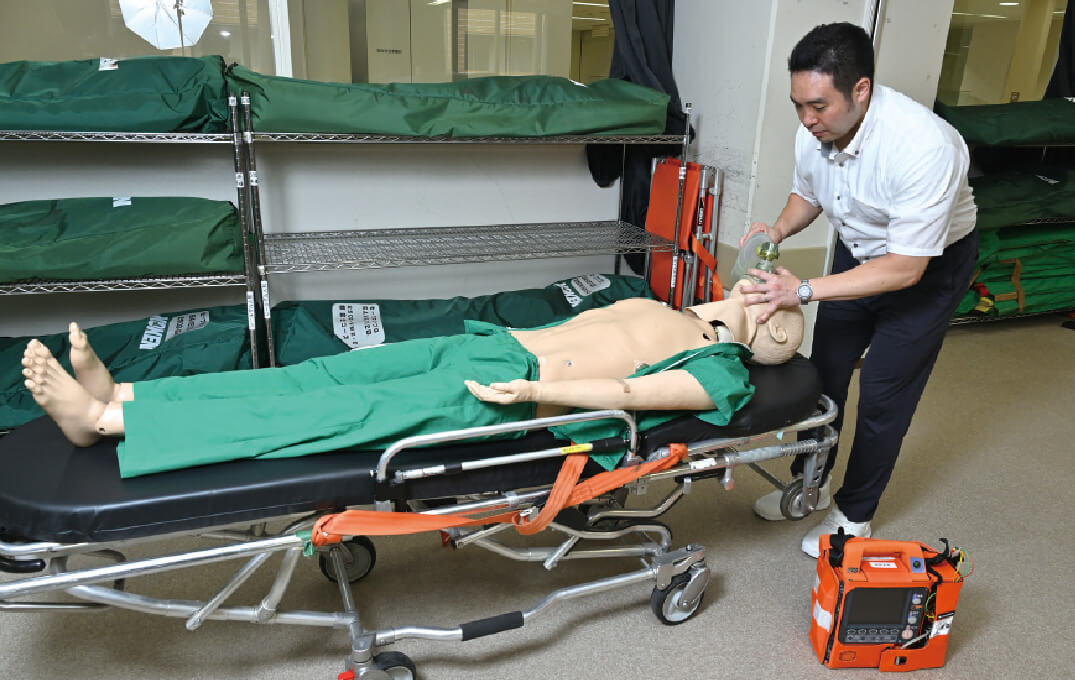 実習室で蘇生(そせい)用マネキンをストレッチャーに寝かせ、バックバルブマスクを使った人工呼吸の指導をしています