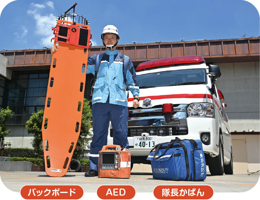 緊急走行などの運転ができる救急機関員という資格も取得している本川さんは、救急車を運転することもあります。車内には交通事故など現場でけがをした人を安静な状態で運ぶ「バックボード」、AED(自動体外式除細動器)、隊長かばんなどを持ち込みます。背中には酸素ボンベを背負っています