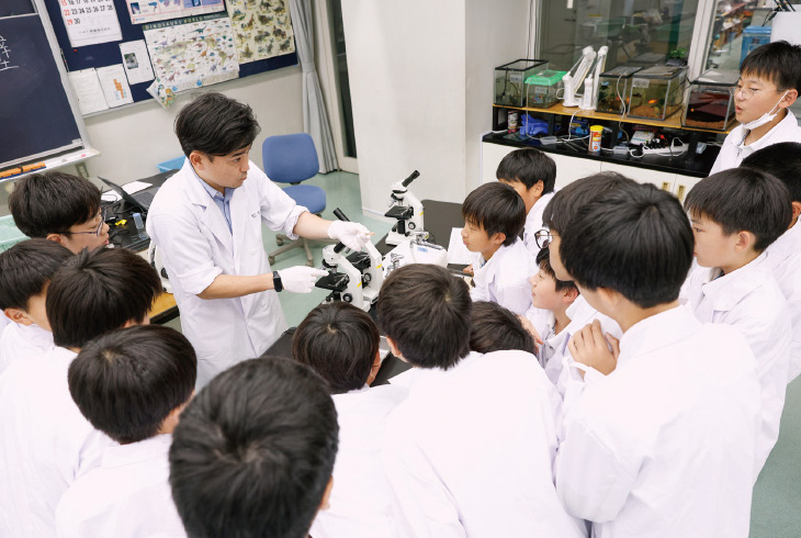 大きな窓に囲まれ、明るく開放的な雰囲気の生物実験教室。生き物を育てる水槽や標本が置いてあり、生徒1人に1台の顕微鏡が用意されています。中1の「科学実験」の授業は、この教室で行います。