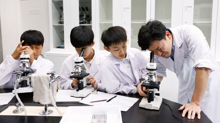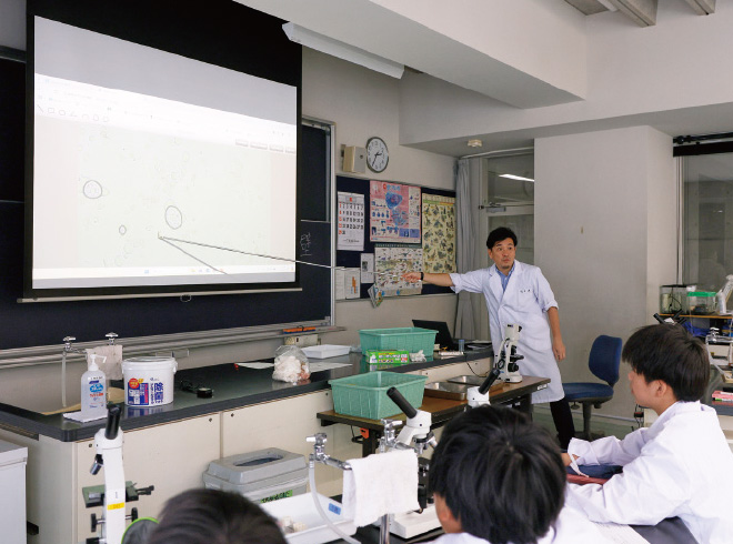 「科学実験」の授業は40年以上続いており、中1では約25テーマの生物の実験を行います。最初は顕微鏡の使い方、スケッチの練習などから始めますが、徐々に本格的なものに挑戦していきます。今後は分析する項目が多くなり、たとえばタマネギが大きくなるときは、細胞の数が増えているのか、1個の細胞が大きくなっているのか、何回かの授業で実験してみて、データを取って検証するそうです。