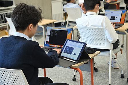 入学時より1人1台のiPadを所有し、授業だけでなく校外学習などの行事や委員会など、さまざまな活動に取り入れ、活用することで、生徒の創造性を育てることをめざしています。また、プログラミング教育にも力を入れており、中学ではコーディングを学びロボットの制御や簡単なゲーム作り、高校ではアプリ制作なども行っています。こうした取り組みにより、「Apple Distinguished School」にも認定されています。