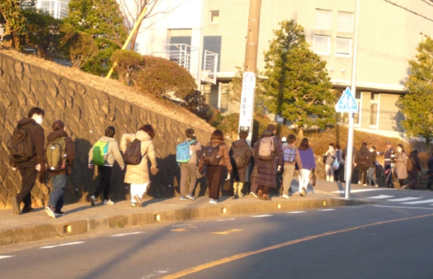 JR大船駅西口を出て、西に約15分歩くと、左手に見えてくるのが栄光学園中です。この日の早朝には通称「栄光坂」を上る受験生の長い列が続きます。開門時刻の7時15分には30組ほどの受験生親子が並びました。正門が開くと、受験生は少し歩いて右手の階段を上って試験会場へ。保護者の方は控室となった聖堂棟で待機したり、いったん大船駅方面に戻ったりしていました。