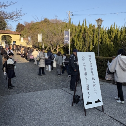 神戸女学院の正門前の道は、例年どおり中学入試の入り口と、大学入学共通テストの入り口が左右で分けられていました