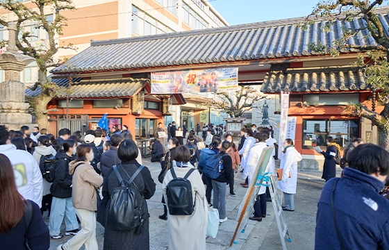 大阪府の四天王寺も、17日に入試を実施しました。同校の校舎は、聖徳太子が建立した和宗総本山・四天王寺の境内の一角にあります。開門時刻は8時ですが、例年と同じく予定時刻より10分早い7時50分には門が開かれました。受験生が姿を見せ始めたのは7時30分を過ぎたころで、早めに到着して四天王寺にお参りをする親子の姿も見られました。7時45分になると境内が混み始め、8時から8時15分までが混雑のピークとなります。校門から構内に入れるのは受験生のみのため、ピーク時の校門前は見送りをする保護者で一時的に混雑しましたが、8時15分を過ぎるとそれも落ち着きました。