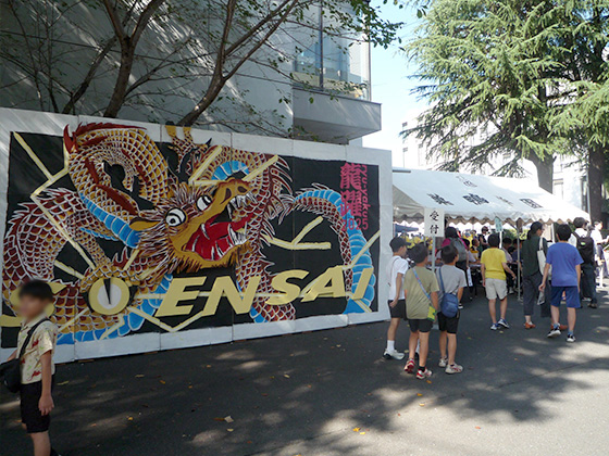 朝から多くの親子が楽しそうに来場。校門を入ると迫力ある龍の巨大な立体看板が迎えます