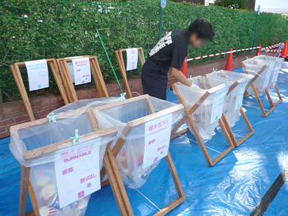 広い飲食エリアにわかりやすくごみ箱を設置。担当の生徒がていねいに分別を案内しています