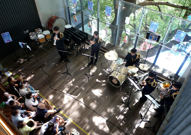 一方、校舎からは吹奏楽のアンサンブルの心地よい演奏が聞こえてきます。大きな木を囲むような構造の校舎の3階、吹き抜けのウッドデッキをステージに、吹奏楽班のパフォーマンスが始まりました。木漏れ日がやさしく差し込むなかで、聴衆が穏やかな表情で演奏に耳を傾けています。