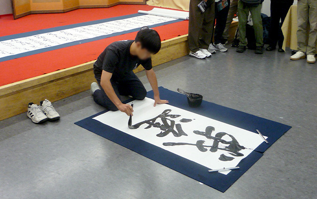 書道班の実演を来場者が静かに見守ります。美しく力強い作品に拍手が起こります