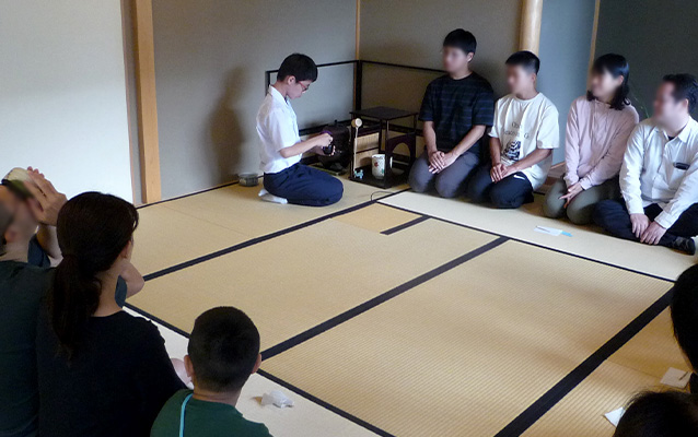 賑やかな屋外とは対照的な、静寂の茶室。茶道班がお点前を披露し、おもてなしをする「巣園茶会」で心を落ち着かせます