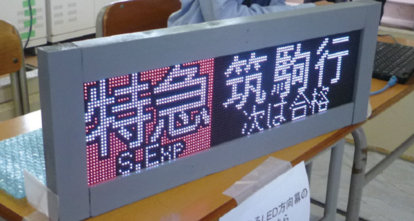 鉄道研究部オリジナルのLED方向幕「特急筑駒行 次は合格」。聞きたい発車メロディーをリクエストして流してもらえるコーナーもありました