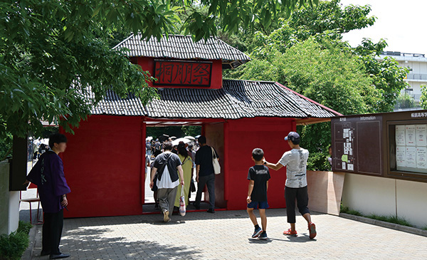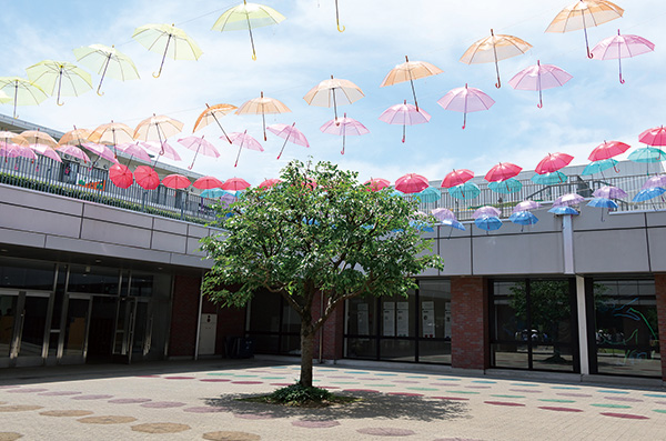 昇降口に飾られた、青空に映えるカラフルな傘が来場者を出迎えます