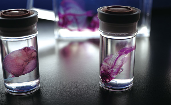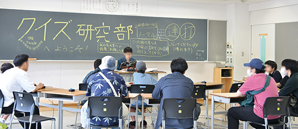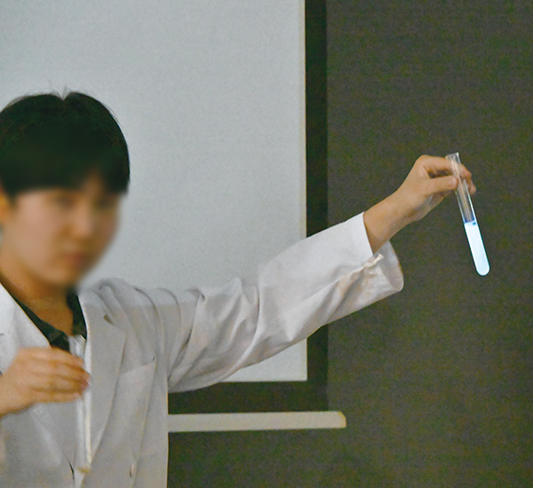 楽しい実験演示で人気の化学部は、炎色反応や時計反応など、華やかな実験ショーを来場者の目の前で披露し、化学のおもしろさを伝えました。地学部では、人気の砂金探し体験のほか、生徒たちが発掘した化石や鉱物を間近で観察することができます。小学生たちも興味深そうな様子で、部員による解説に耳を傾けていました。
