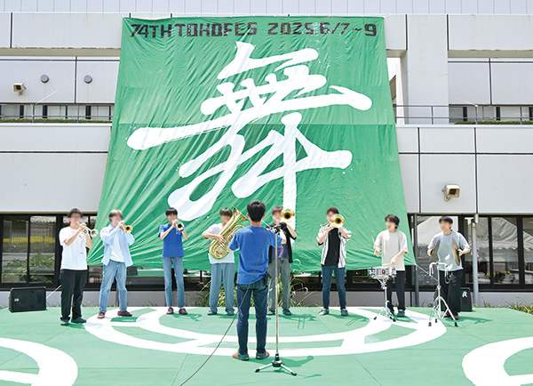 編集部が訪れたのは初日の7日です。情熱的な赤が印象的な「桐朋門」が、来場者を出迎えます。鮮やかな緑色の大垂れ幕が目をひく共用棟2階テラスのステージで行われるのは、恒例の開会式です。文化祭実行委員長と、校長の原口大助先生のあいさつなどの後、音楽部による華やかなファンファーレとともに、桐朋祭の開幕が宣言されました。