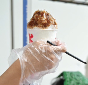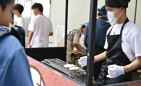この日の開場時刻は12時だったこともあり、食券売り場やパン売り場は来場者で早々に混雑し、各飲食団体にも軒並み長い列ができています。当日は夏日となり、スキー部によるかき氷が大盛況。メロン・イチゴ・ブルーハワイといった定番だけでなく、杏仁豆腐・コーヒー・ライチなど珍しいフレーバーも楽しめるとあって、多くの人が注文の列に並びます。また、焼きそばやベビーカステラといったフードも用意され、お祭り気分を盛り上げていました。