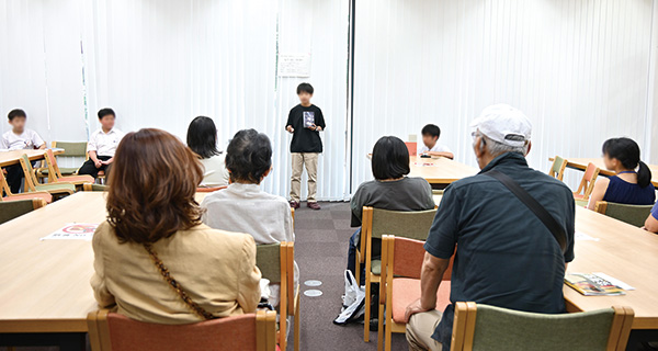 図書館では、図書委員会によるビブリオバトルが開催されていました。中1・2の4人が登場し、それぞれが多くの人に読んでもらいたい書籍の魅力を5分という制限時間内に語ります。本のジャンルも、恐竜学者のエッセイや青春小説、ミステリーなど多岐にわたり、桐朋生の軽妙な語り口も相まって、参加者から笑い声が上がるなど、和やかな雰囲気に包まれていました。