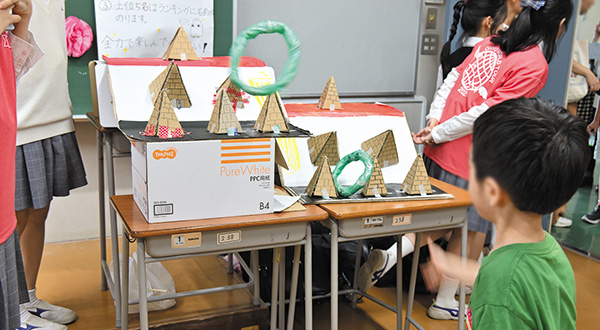 世界一周をテーマにした中2の学年展示。エジプトのピラミッドやツタンカーメンをモチーフにしたゲームで来場者を楽しませたクラスもありました
