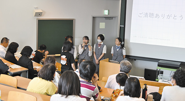 日ごろの授業、グループ学習、留学体験、外部プログラムについての発表が行われた「@階段教室」。生徒広報係は生き生きとした笑顔で学園の魅力をアピールしました