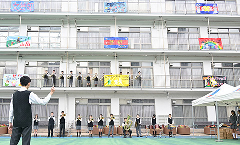 編集部が訪れた8日も、開場の12時に合わせて大勢の来場者が並んでいました。門が開くと、スタッフの案内で受付のある校庭へと進みます。器楽部による華やかなファンファーレが響き渡り、いよいよ2025年の展覧会がスタートしました。校則がなく、服装も自由な同校ですが、この日は全生徒が基準服を着用していました。