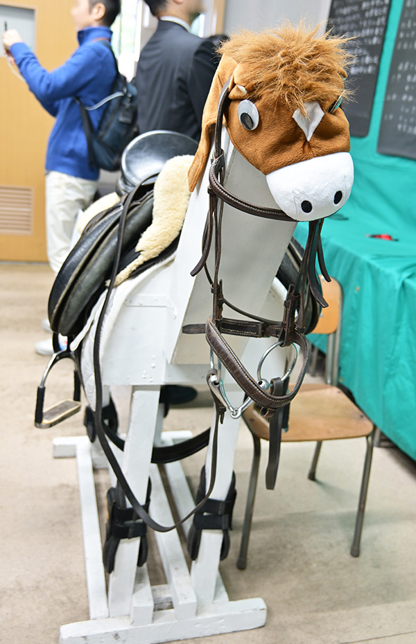馬術部では、練習用の木馬も展示。実際にまたがることができました