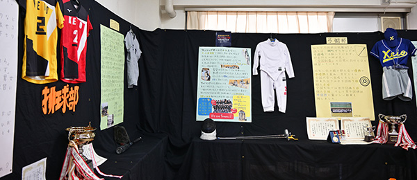 フェンシング部をはじめ、珍しい校友会(クラブ)があるのも中等部の特徴です。野球部のユニホームやトロフィーも展示されていました