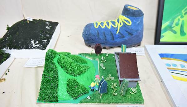 「1年生学年の部屋」の展示。林間学校で訪れた斑尾高原周辺の地形・動植物・歴史・文学などを研究・調査し、その成果をさまざまな形で表現しました
