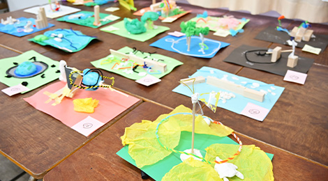中3の選択授業「ものづくり×SDGs」の受講者が、自分が達成したいSDGsの目標をテーマに立体作品を制作